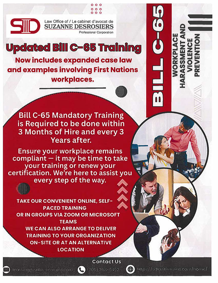 We also offer online via Zoom or Microsoft Teams and in person be it in Timmins, in your community or any other community the above training. In addition, we also offer the following training for Federally governed employers. Some of the additional training that we provide for Federal Employers includes: